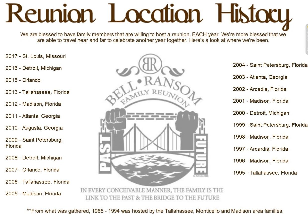 Since 1969, our Bell-Ransom Family Reunion has been held in various cities, starting in Tallahassee. Thanks to our committee and Reunion Hosts in each city for taking time to host.